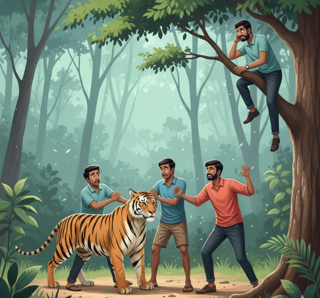 चौथा मित्र पेड़ पर चढ़ गया ताकि सुरक्षित रहे। तीसरे ने मंत्र पढ़ना शुरू किया और शीघ्र ही शेर दहाड़ता हुआ जीवित हो उठा। शेर ने सामने तीनों मनुष्यों को देखा और वह उन पर टूट पड़ा। उसने एक को पंजे से पकड़ा, दूसरे को धक्का देकर गिराया और तीसरे को दांतों से जकड़ा; कुछ ही क्षणों में तीनों शेर का आहार बन गए। पेड़ पर बैठा चौथा मित्र यह दृश्य देखकर विलाप कर उठा और सोचने लगा, काश उन्होंने मेरी बात मानी होती।