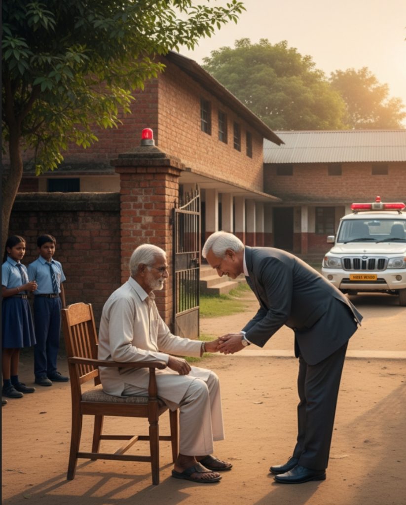 जिला कलेक्टर दौड़कर एक वृद्ध टीचर के पैरों में गिर जाते हैं और कहते हैं –