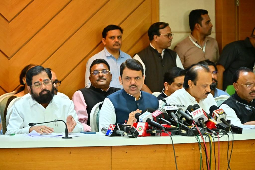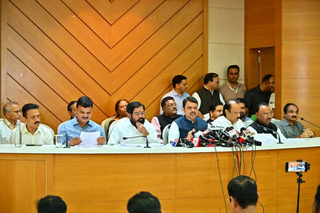 मंत्रिमंडल बैठक के बाद हुई इस प्रेस कॉन्फ्रेंस में उपमुख्यमंत्री एकनाथ शिंदे, उपमुख्यमंत्री अजित पवार, राजस्व मंत्री चंद्रशेखर बावनकुले, कृषि मंत्री दत्तात्रय भरणे, जलसंपदा मंत्री गिरीश महाजन, ओबीसी कल्याण मंत्री अतुल सावे, राहत व पुनर्वसन मंत्री मकरंद जाधव पाटील, परिवहन मंत्री प्रताप सरनाईक, सार्वजनिक बांधकाम मंत्री शिवेंद्रसिंह भोसले, मुख्य सचिव राजेशकुमार तथा अन्य वरिष्ठ अधिकारी उपस्थित थे।