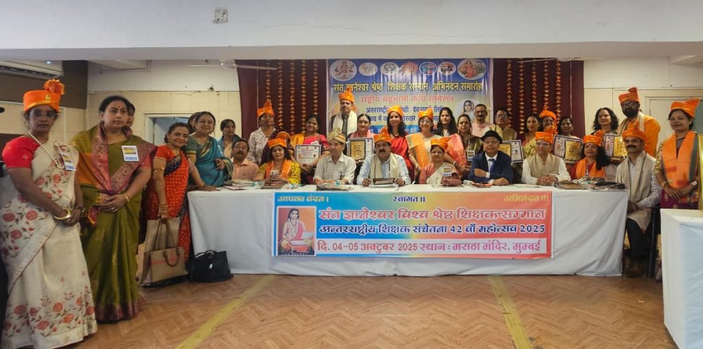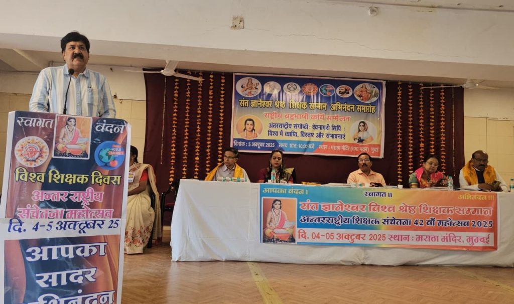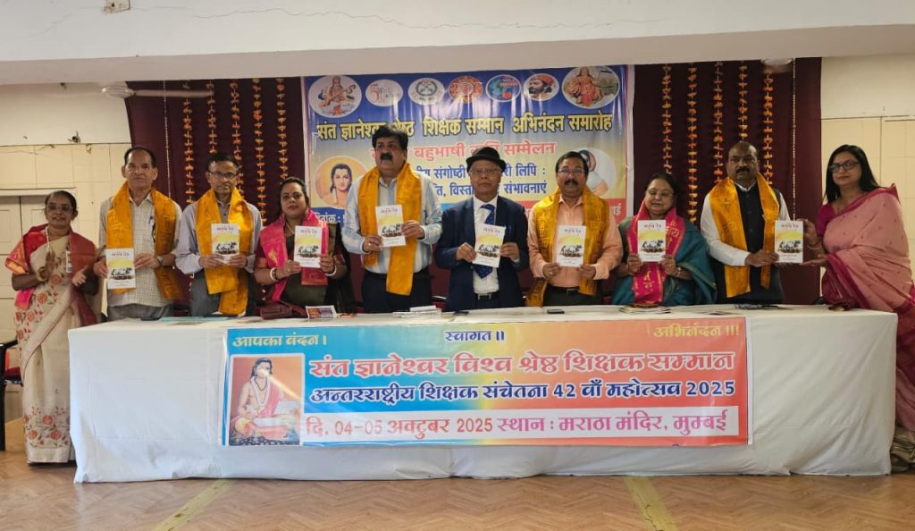 ◆ मुंबई। राष्ट्रीय शिक्षक संचेतना उज्जैन द्वारा नागरी लिपि परिषद, नई दिल्ली एवं मराठा मंदिर, साहित्य शाखा, मुंबई के सहयोग से आयोजित समारोह के अवसर पर देवनागरी लिपिः विश्व में व्याप्ति विस्तार और संभावनाएँ, विषय पर अन्तरराष्ट्रीय संगोष्ठी आयोजित की गई। विश्व शिक्षक दिवस के अवसर पर यह आयोजन शिक्षाविद एवं साहित्यकारों को संत ज्ञानेश्वर श्रेष्ठ शिक्षक एवं साहित्य सम्मान से सम्मानित किया गया।