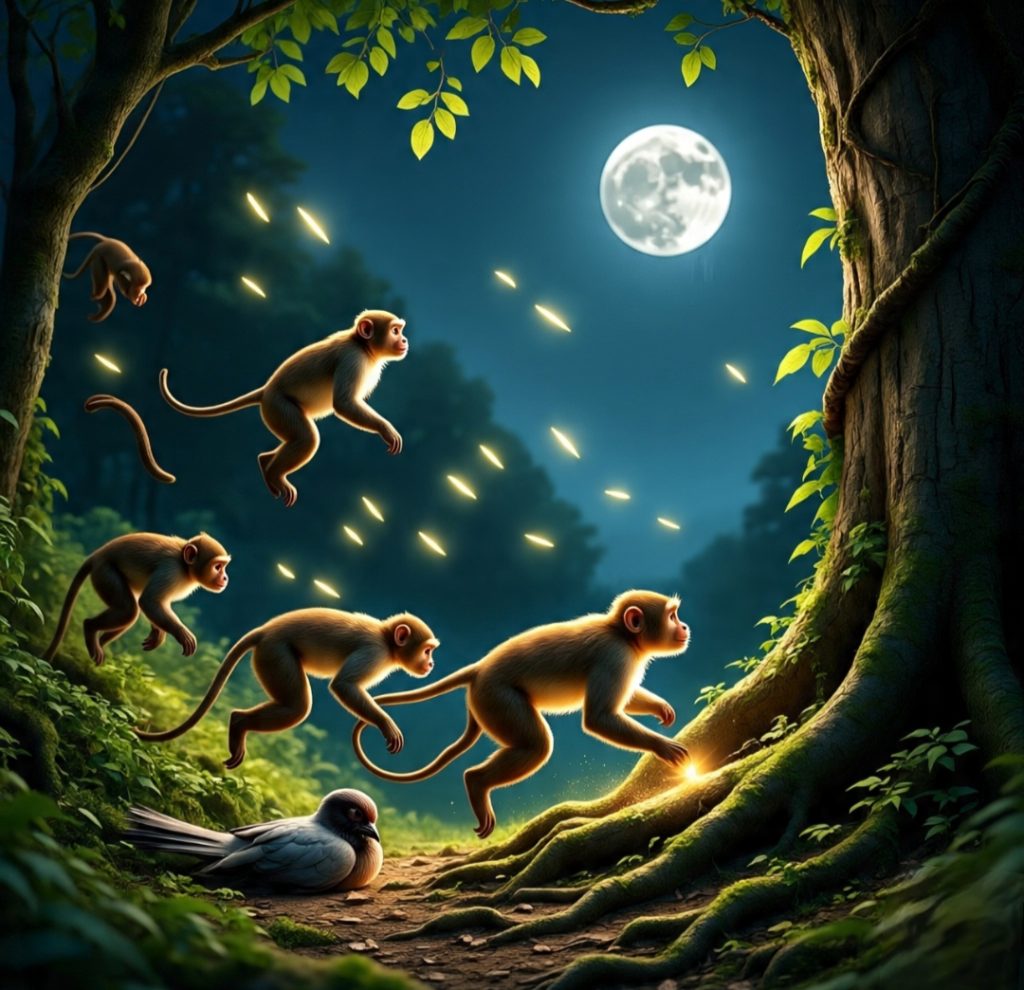 सभी बंदरों ने दौड़-दौड़कर पत्तियाँ और लकड़ियाँ इकट्ठा कीं और ढेर बना लिया। अब वे सोचने लगे कि इसे कैसे जलाया जाए। तभी एक बंदर की नजर आसमान में उड़ते हुए जुगनू पर पड़ी। वह चिल्लाया, “देखो! यह तो हवा में उड़ती चिंगारी है। इसे पकड़कर नीचे डालते हैं, आग तुरंत जल जाएगी।” बाकियों ने उसकी बात पर विश्वास कर जुगनू को पकड़ लिया और ढेर के नीचे रख दिया।