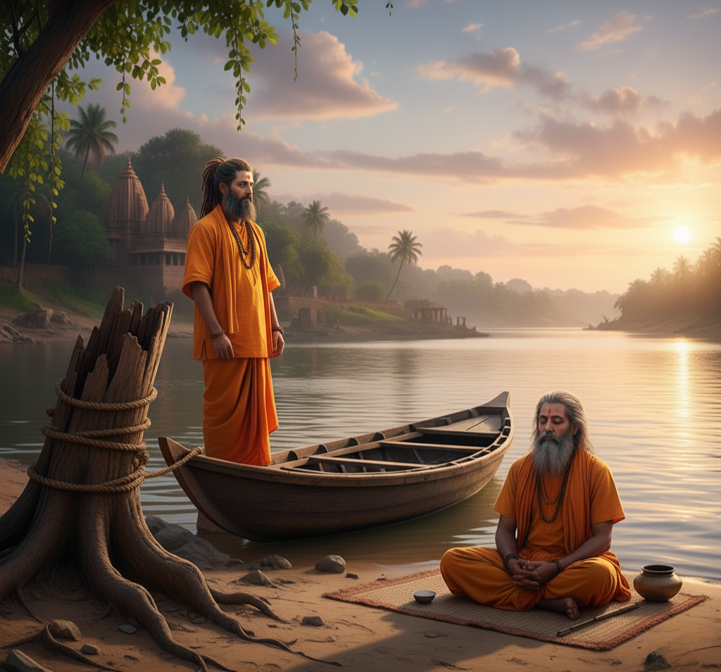 एक दिन वे जंगल से लौटकर अपने गाँव पहुँचे। कुछ समय बाद उन्हें किसी कार्य से शहर जाना था। मार्ग में एक नदी पड़ती थी, जिसे पार करने के लिए नावों की सुविधा उपलब्ध थी। जब वे नदी किनारे पहुँचे तो उन्होंने देखा कि दूसरे तट पर एक और ऋषि पेड़ के नीचे ध्यानमग्न बैठे हैं।