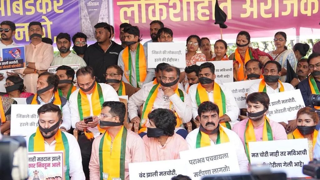 मुंबई में शनिवार को मतदाता सूची में कथित अनियमितताओं को लेकर सियासी तापमान चढ़ गया। एक ओर महा विकास अघाड़ी (एमवीए) जिसमें उद्धव ठाकरे, शरद पवार, बालासाहेब थोरात और राज ठाकरे जैसे नेता शामिल थे, ने ‘सत्य के लिए मार्च’ निकालकर चुनाव आयोग पर सवाल उठाए तो दूसरी ओर भारतीय जनता पार्टी (भाजपा) ने इसके विरोध में ‘मूक प्रदर्शन’ किया।