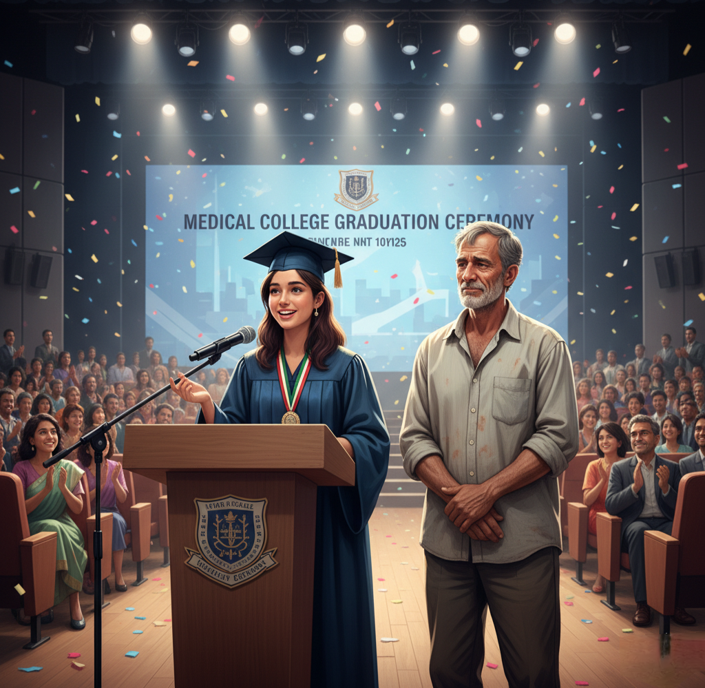 तालियों की गड़गड़ाहट में श्यामलाल की आंखें भर आईं। आर्या ने मेडिकल एंट्रेंस में टॉप किया। सम्मान समारोह में श्यामलाल ने कहा, “मैं कोई बड़ा आदमी नहीं, बस एक इंसान हूं जिसने एक रात किसी को गिरते देखा और थाम लिया।”