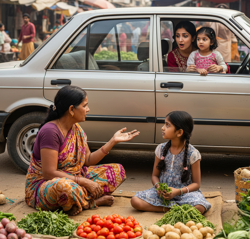 यह सुनकर कार में बैठी महिला की आँखें झुक गईं। उसे गहरा पश्चाताप हुआ कि एक सब्जीवाली अपनी बेटी को इंसानियत और शिष्टाचार का अमूल्य पाठ सिखा रही थी, जबकि वह स्वयं अपनी संतान को ऊँच-नीच का भाव सिखा रही थी।