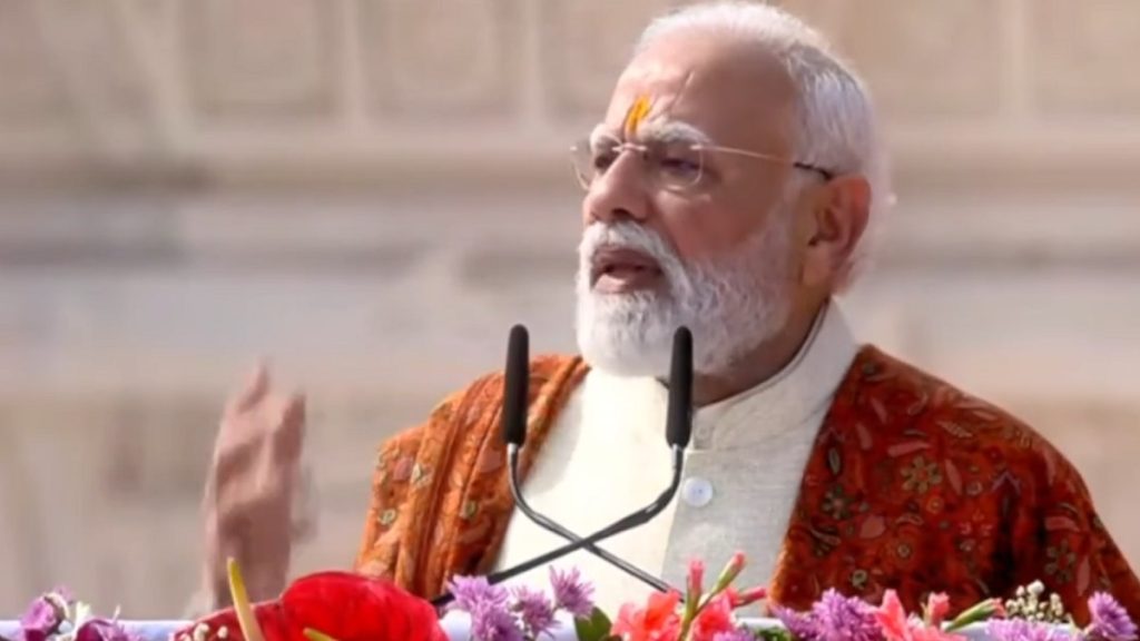 प्रधानमंत्री मोदी ने कहा कि आज सदियों पुराने घाव भर रहे हैं और पूरी दुनिया राममय हो गई है। उन्होंने राम को विनम्रता में महाबल का प्रतीक बताते हुए कहा कि हमें अपनी जड़ों से जुड़ना होगा और गुलामी की मानसिकता से पूरी तरह मुक्त होना होगा। पीएम ने राम मंदिर निर्माण में योगदान देने वाले कारीगरों, वास्तुकारों और श्रमिकों को प्रणाम किया तथा रामायण के महत्त्वपूर्ण पात्रों के माध्यम से समरसता और सेवा की भावना का संदेश दिया।