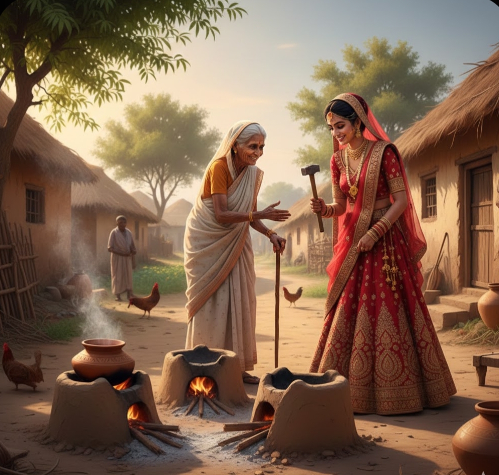 बुढ़िया अम्मा ने झाड़ू, गोबर और मिट्टी दी और साथ में अपनी पोती को भेज दिया। वापस आकर बहू ने एक चूल्हा छोड़ बाकी सभी चूल्हे फोड़ दिये। सफाई कर गोबर-मिट्टी से झोपड़ी और दुआर लीपा। फिर उसने सभी पोटलियों के चने एक साथ किए और अम्मा के घर जाकर चना पीसा। अम्मा ने उसे साग और चटनी भी दी।