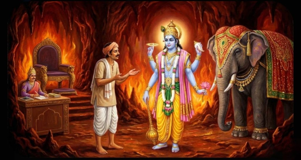युवक बोला,”मैं अकेला नहीं जाऊँगा। जिस हाथी के कारण मैं यहाँ आया, उसे भी वैकुण्ठ की आज्ञा दीजिए।”
