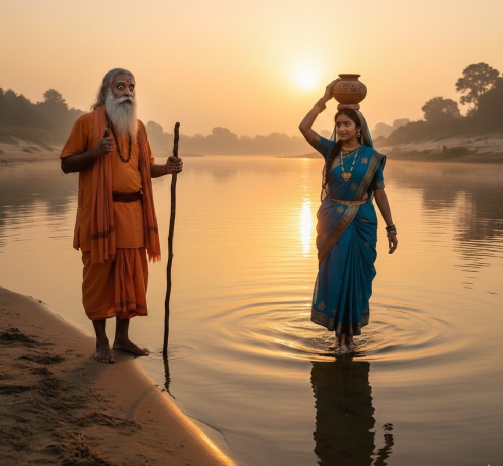 जब गोपी ने देखा कि संत पानी में गिर गए हैं तो वह लौट आई। गोपी ने संत का हाथ पकड़ा और जैसे ही आगे बढ़ी, संत भी गोपी की भाँति भूमि पर चलने लगे।
