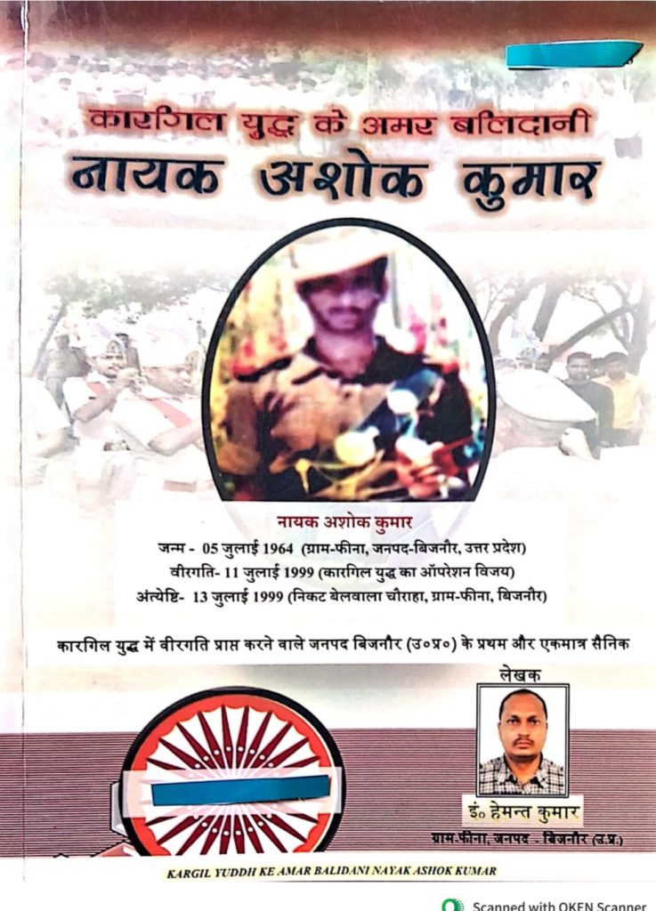 सुप्रसिद्ध इतिहासकार, वैज्ञानिक एवं पर्यावरण कार्यकर्ता इंजीनियर हेमन्त कुमार की पुस्तक “कारगिल युद्ध के अमर बलिदानी नायक अशोक कुमार” (कारगिल युद्ध में वीरगति प्राप्त करने वाले जनपद बिजनौर, उत्तर प्रदेश के प्रथम और एकमात्र सैनिक) अपने आप में एक अनोखी और शोधपरक कृति है।