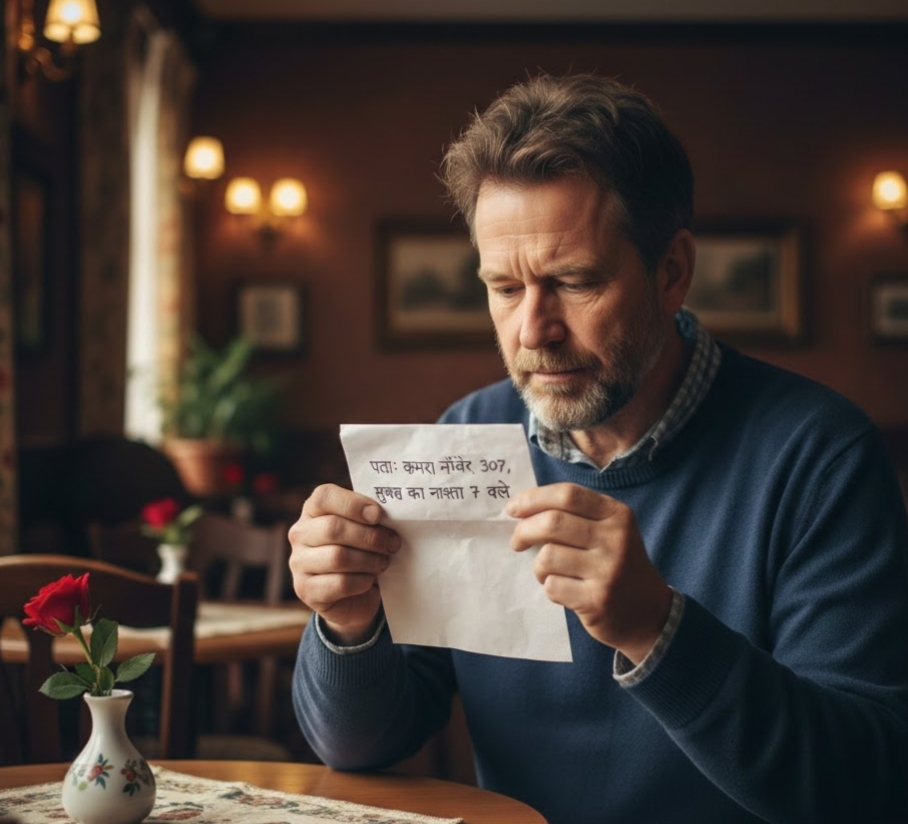 उसने एक गहरी, लंबी साँस ली और टेबल साफ करने लगा। टिश्यू पेपर उठाकर कचरे में डालने ही वाला था,