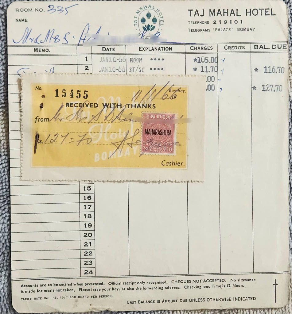 10 जनवरी 1966 को ताजमहल पैलेस में एक रात ठहरने का किराया केवल 105 रुपये था। इसमें सर्विस और स्टाफ चार्ज 11 रुपये 70 पैसे जोड़ने के बाद कुल बिल 116 रुपये 70 पैसे हुआ। थोड़े और खर्च जोड़ने के बाद टोटल 127.70 रुपये बन गया। उस समय 10 ग्राम सोना लगभग 84 रुपये में बिकता था, जिससे यह रकम उस दौर में भी किसी आम नागरिक के लिए बड़ी थी।