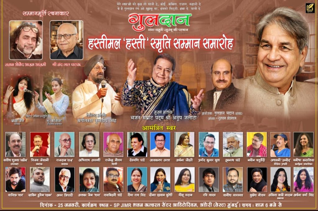 हिंदी-उर्दू साहित्य और सांस्कृतिक सरोकारों को समर्पित प्रतिष्ठित संस्था ‘गुलदान’ के तत्वावधान में हस्तीमल ‘हस्ती’ स्मृति सम्मान समारोह का आयोजन 25 जनवरी को किया जा रहा है। यह भव्य साहित्यिक-सांस्कृतिक कार्यक्रम एसपी जैन इंस्टीट्यूट ऑफ मैनेजमेंट एंड रिसर्च भवन, कल्चर सेंटर ऑडिटोरियम, अंधेरी-वेस्ट, मुंबई में शाम 6 बजे से आयोजित होगा। कार्यक्रम के मुख्य अतिथि सुप्रसिद्ध भजन सम्राट पद्मश्री अनूप जलोटा होंगे। विशेष अतिथि के रूप में संगीतकार कुलदीप सिंह शिरकत करेंगे।