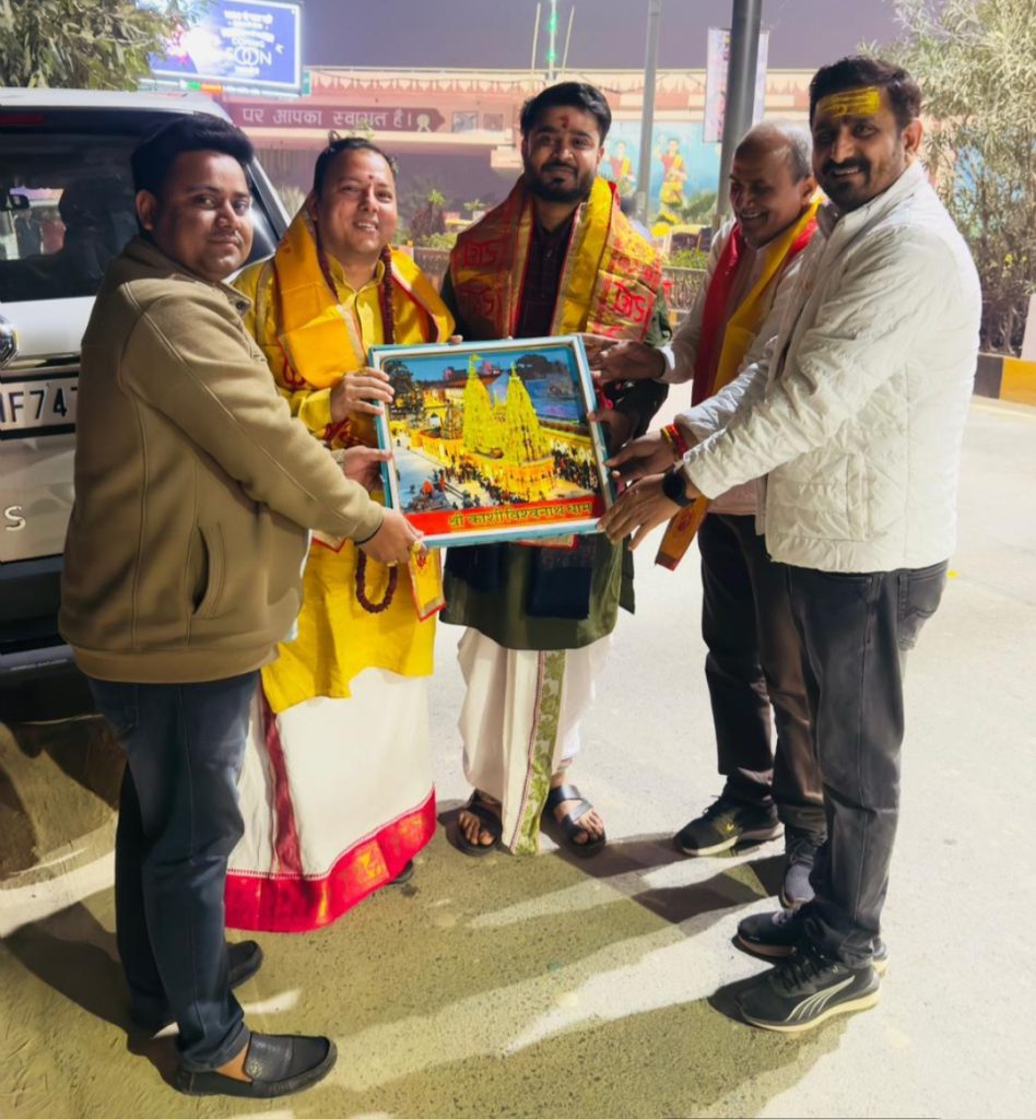वाराणसी बाबतपुर स्थित लाल बहादुर शास्त्री एयरपोर्ट पर मंगलवार की रात अयोध्या धाम श्री राम मंदिर के पुजारी संतोष तिवारी महाराज जी के छोटे पुत्र आचार्य प्रभु श्रीराम कृपा गुरुकुल वेद पाठशाला के अभिषेक तिवारी एवं अयोध्या धाम के आचार्य दुर्गा प्रसाद गौतम के काशी आगमन पर वरिष्ठ समाजसेवी विनीत त्रिपाठी एवं अभिषेक त्रिपाठी ‘सुमित’ द्वारा मोमेंटो, अंग वस्त्र एवं माल्यार्पण कर स्वागत किया गया। विनीत त्रिपाठी द्वारा रुद्राक्ष की माला भी भेंट की गई।