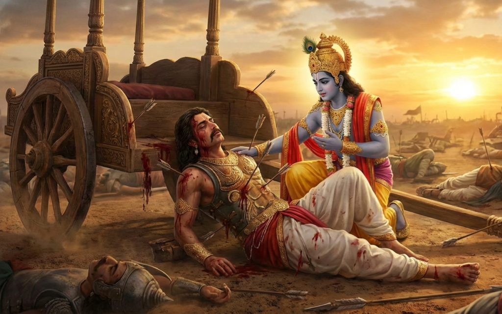 कृष्ण ने गंभीर स्वर में कहा- अपमान, अभाव और पीड़ा हमें अधर्म का अधिकार नहीं देते। मनुष्य की पहचान उसकी परिस्थितियों से नहीं, उसके चुनावों से होती है। तुम वीर हो, दानी हो, परंतु धर्म की सीमा लांघकर वीरता भी कलंकित हो जाती है।