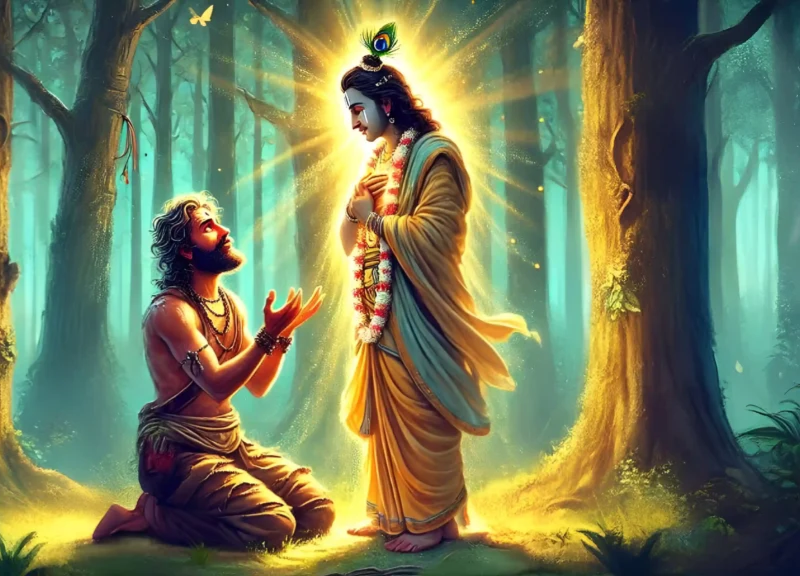 बाबा ने जब यह दृश्य देखा तो क्या देखते हैं-किरात के कंधे पर स्वयं श्रीकृष्ण विराजमान हैं और जाल में से मुस्कुरा रहे हैं! संत के होश उड़ गए। वे किरात के चरणों में गिर पड़े। फिर ठाकुरजी से कातर वाणी में बोले, “हे नाथ! मैंने बचपन से अब तक कितने प्रयत्न किए। आपको अपना बनाने के लिए घर-बार छोड़ा, इतना भजन किया; फिर भी आप नहीं मिले, और इसे तीन दिन में ही मिल गए!”